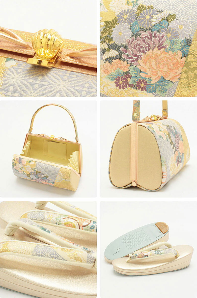 バッグと草履の花緒にはゴールド地をベースに扇面に菊模様が大胆に刺繍されている個性的なデザイン。